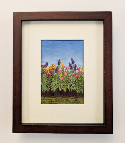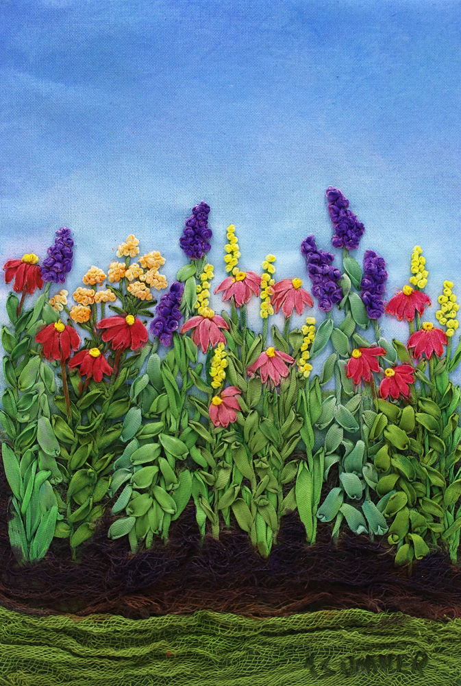 A mixed-media textile work that explores a lush, dreamlike mood, where a vibrant midsummer garden of blooming wildflowers, rendered in silk ribbon embroidery, rises organically from a softly painted sky and earth background  painted on fabric, with delicate accents of watercolor pencil and oil pastel enhancing the ribbon’s texture and tonal depth to create an immersive, pleasurable, and emotionally striking atmosphere.