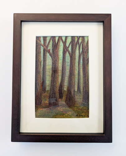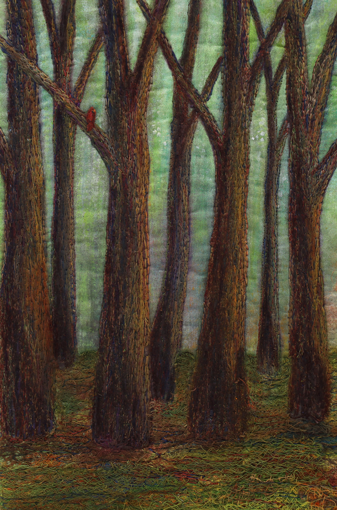 A mixed-media textile work that explores a quiet, contemplative mood, depicting a stand of slender forest trees rendered through thread painting, with a small hand stitched red cardinal perched among the branches as a vivid focal point, set against a softly diffused, moss-green woodland background painted on fabric with acrylic medium, resulting in a piece where stillness and presence quietly unfold.
