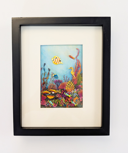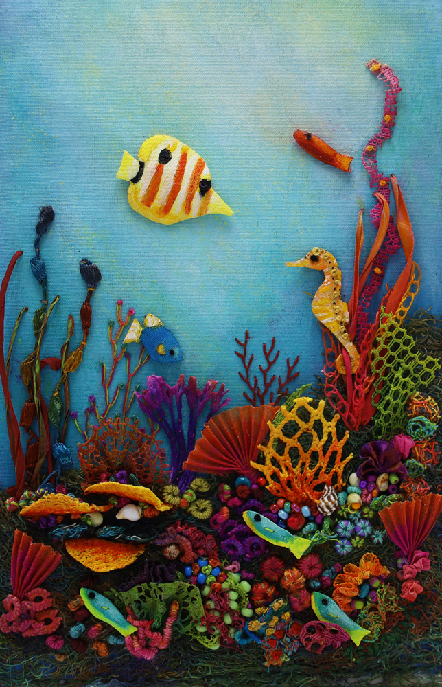 A mixed-media textile work that depicts a whimsical underwater reef scene built from richly layered textiles, where embroidered and stitched sea creatures drift through a hand-painted blue expanse, and dense clusters of coral forms made from thread, fabric, and ribbon create a lush, tactile environment that feels playful, immersive, and alive with color and movement.