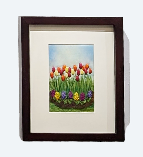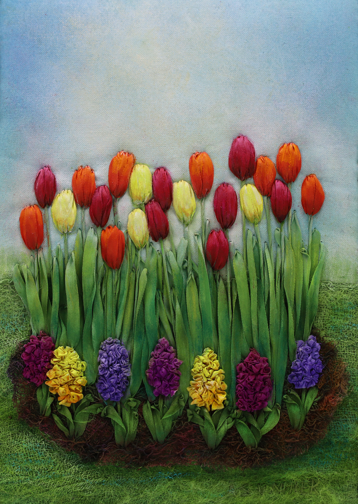A mixed-media textile work that evokes a serene, uplifting mood, where a vibrant row of tulips formed through dimensional fabric and ribbon rising gracefully above a border of densely clustered hyacinths. They all set against a softly blended, atmospheric fabric background, with subtle shading and painterly transitions suggesting an early spring landscape, and the layered textiles, stitching, and surface treatments creating a rich interplay of depth, color, and tactile movement, resulting in a piece that feels fresh, balanced, and quietly celebratory of renewal.