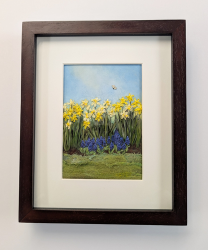 A mixed-media textile work that explores a quiet, luminous atmosphere, where a gentle sweep of spring flowers and a hovering butterfly, rendered in silk ribbon embroidery, emerges from a softly gradated sky and meadow painted on fabric with acrylic medium, while subtle touches of watercolor pencil and oil pastel enrich the ribbon’s texture and tonal depth, creating a tender, airy, and quietly hopeful sensory experience.
