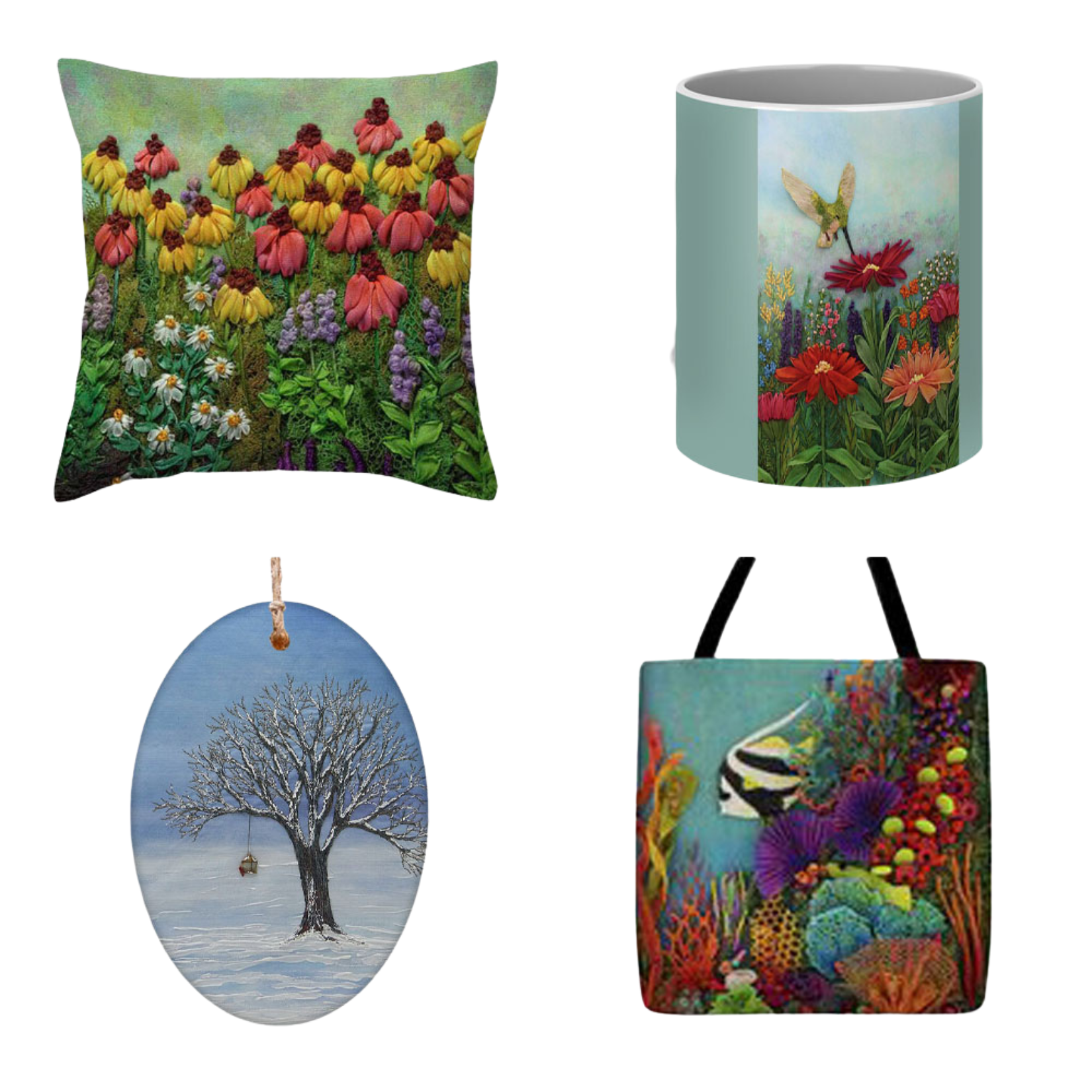 Online Store Explore my shop where original art transforms into unique prints and everyday items you can enjoy. Artwork Classes Book Accessories Gift Cards FEATURED PRODUCTS Uniquely Threaded – Art, Poems, and Stories – Includes shipping & handling $45.00 Spring Bloom Garden Art Card- One on One online course $125.00 Silk Ribbon Wildflowers Art Card Course $125.00 Artwork A Bloom of Jellyfish $225.00 A Burst of Autumn $350.00 Aquatic Symphony $395.00 Attracted to Sweetness – Sold $895.00 Breath of Winter $275.00 Bursting into Bloom $495.00 Daisy Daydreams $275.00 Dragons and the Bells $550.00 Irises and Violets -Sold SEE MORE We Deliver and Ship all over the Country!